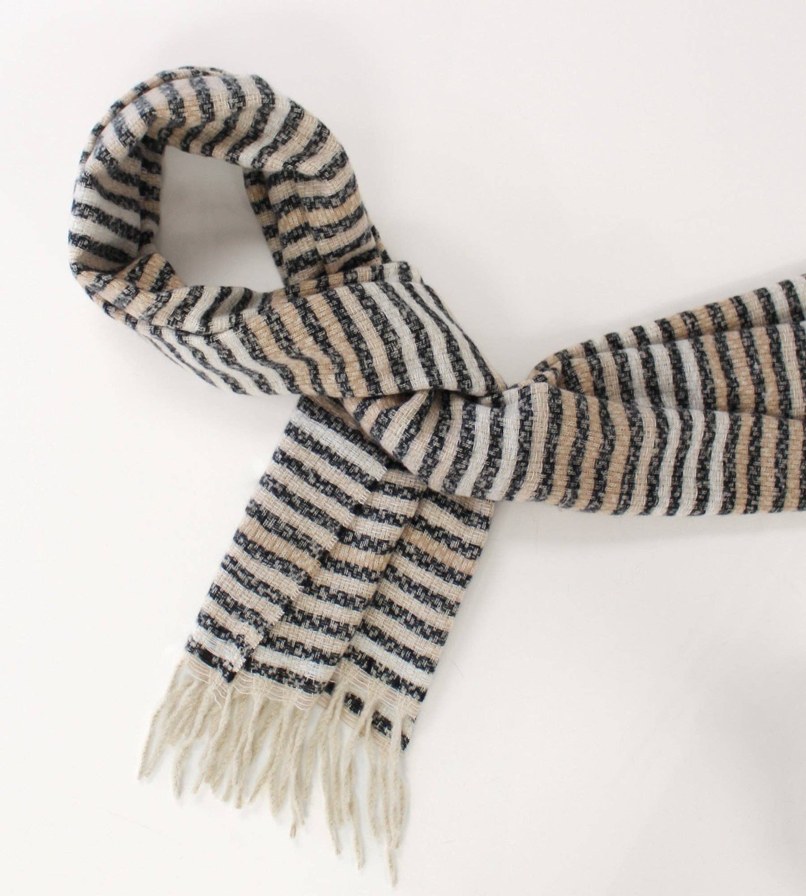 This cozy fall scarf features grey stripes layered over soft shades of beige and white, finished with beige tassels. Its warm, versatile tones make it the perfect accessory to complement any autumn outfit.