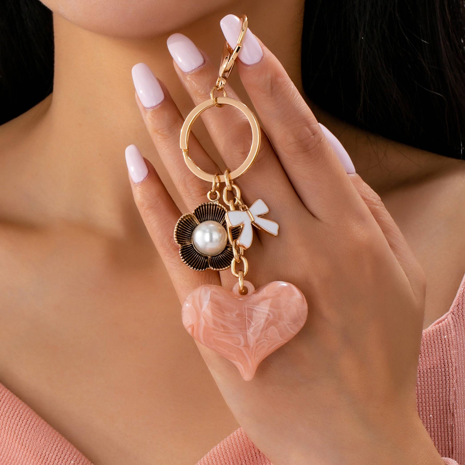 This bag charm key chain, featuring a swirl heart, floral shape with pearl and a dainty bow. The mix of textures and charms perfect way to dress up your favorite handbag. Perfect gift for the holidays, including Christmas, Mother's Day, Valentine's Day.