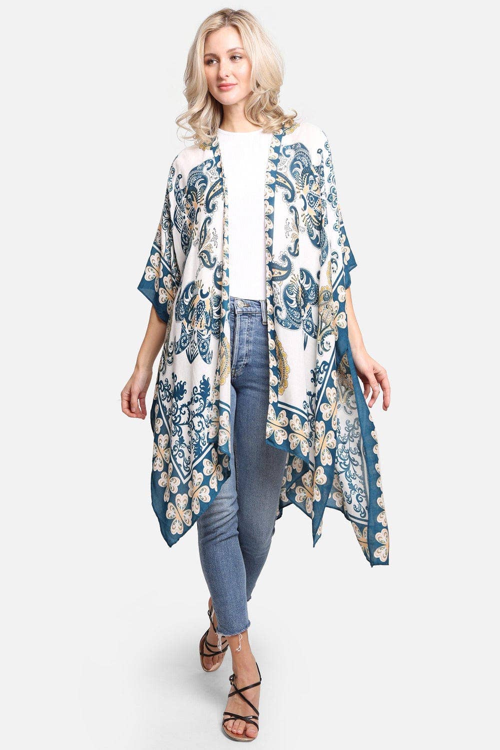 Introducing our Hayley Paisley Print Kimono! Upgrade your wardrobe with this versatile and stylish kimono, perfect for adding a fun pop of color to any outfit. Made with high-quality fabric, this kimono is both comfortable and fashionable. Don't miss out on this must-have piece! * Material: 100% Viscose * Color: Navy, Purple * Measurements: approximately 38"L x 39"W * Care: Machine Wash - Cold (Gentle Cycle), Do Not Bleach, Lay Flat To Dry/ Tumble Dry - Low, Steam/Iron - Low, Do Not Dry Clean * Model is 5'10" and wears size 2